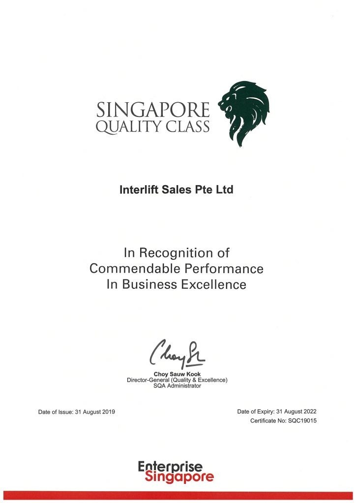 We are pleased to announce that INTERLIFT SALES PTE LTD has been awarded Singapore Quality Class by Enterprise Singapore.